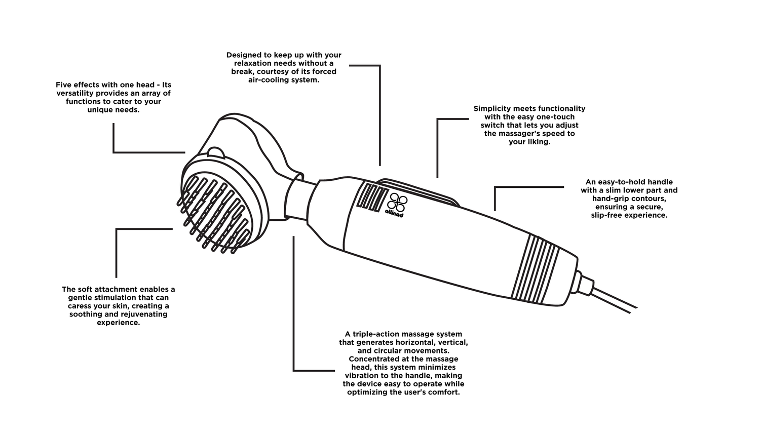 Unlock the full potential of your wellness routine with the Allinad Hand-Held Massager's 'Five Effects with One Head' feature. Its built-in versatility provides a range of therapeutic benefits across the entire body, ensuring a unique and tailored massage experience that adapts to your every need.